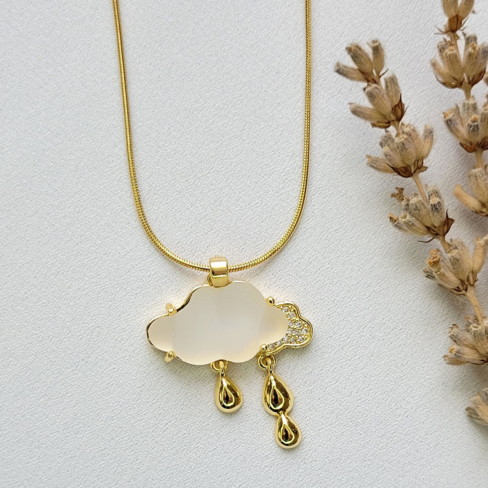 Doğanın sakinliğini ve duygusallığını yansıtan bu özel kolye, altın kaplama bulut figürü ve ucundaki zarif yağmur damlasıyla sade ama etkileyici bir tasarım sunar. Her damla, bir duyguyu temsil eder; umut, yenilenme ve zarafeti boynunuzda taşıyın. Minimal stilinize anlam katan bu tasarım, doğasever ve duygusal ruhlara hitap ediyor.