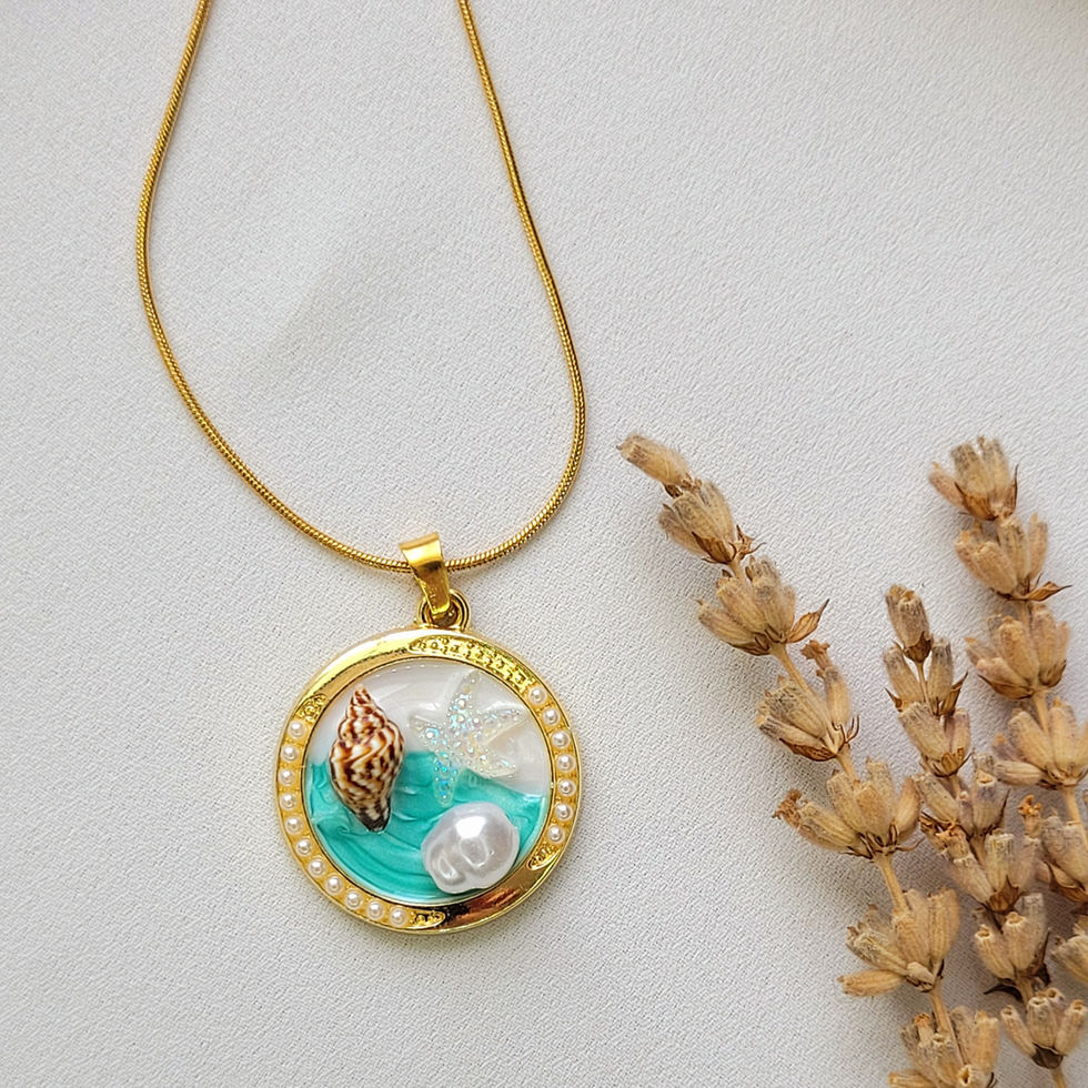 Denizin büyüsünü boynunuzda taşıyın! Gerçek deniz kabuğu, inci ve denizyıldızı detaylarıyla bezeli bu zarif kolye, altın renkli çerçevesi ve minik inci boncuklarla çevrelenmiş tasarımıyla tüm dikkatleri üzerine çeker. Günlük stilinize şıklık katmak ya da özel birine anlamlı bir hediye vermek için harika bir seçim.